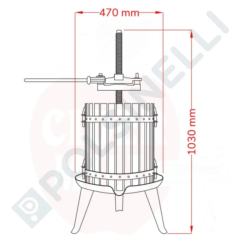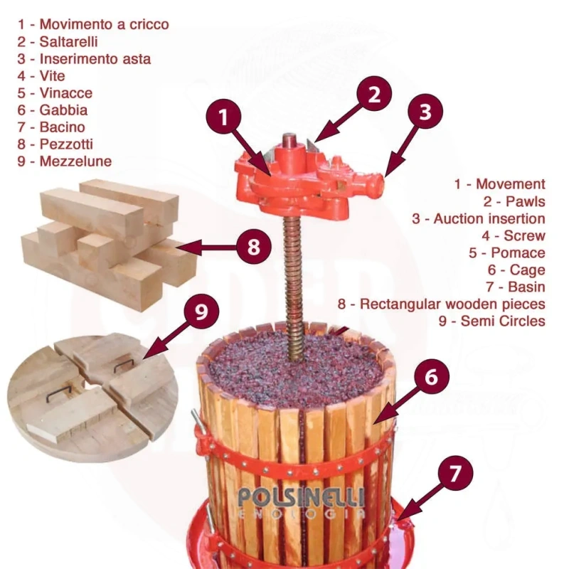 30 cm vipupuristin on poikkeuksellisen laadukas työkalu, joka on olennainen viininvalmistuksessa ja pystyy tehokkaasti uuttamaan mehun puristejäännöksestä tehokkaan vivun ansiosta. Kokonaan Italiassa valmistettu, se tarjoaa pientuottajille ja tiloille korkeimman standardin tuotteen. Se koostuu häkistä, jossa on puiset sauvat, halkaisija 30 cm ja kapasiteetti 50 kg rypäleitä. Häkkiä tukee vahva metallirunko, joka kestää myös korkeat paineet. Keskimmäinen ruuvi on valmistettu vedetystä teräksestä pitkäikäisyyden varmistamiseksi.