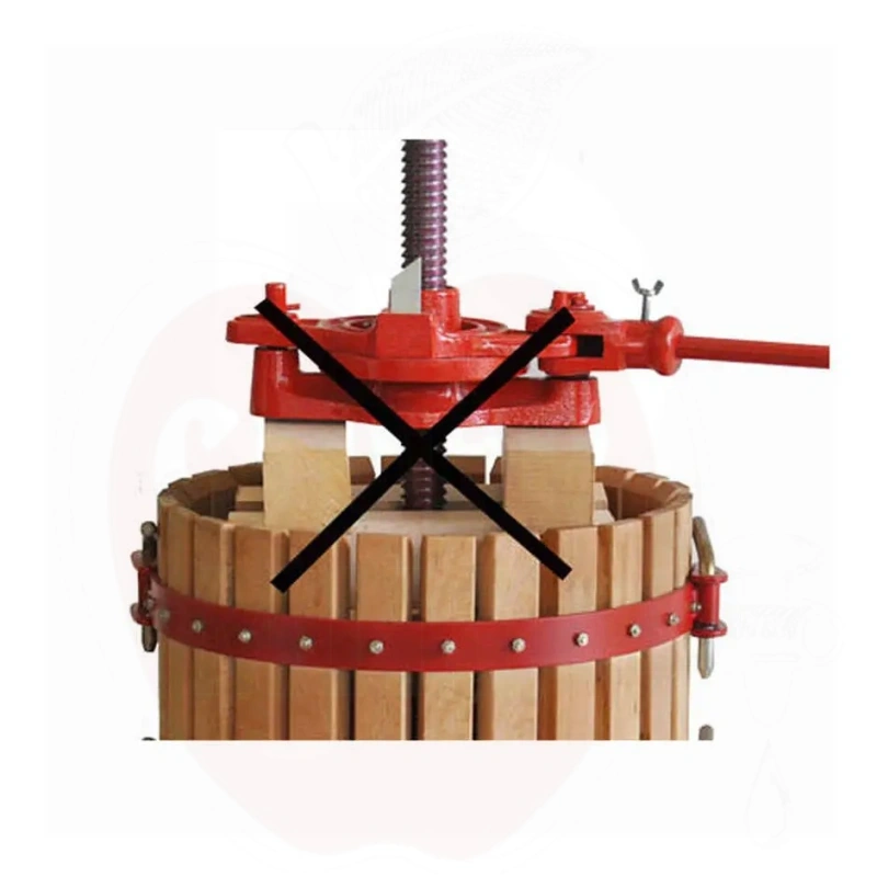 2. Puristimen täyttö: Poista kaikki sisäiset puuosat ja sulje häkki mukana toimitetuilla tulpilla. Nosta tunkkia ylöspäin kierreruuvia pitkin (kiertämällä vastapäivään), täytä häkki rypälemassalla ja aseta kaksi puoliympyrän muotoista puupuristuslevyä. Aseta puupalat puolikuiden päälle kohtisuoraan.