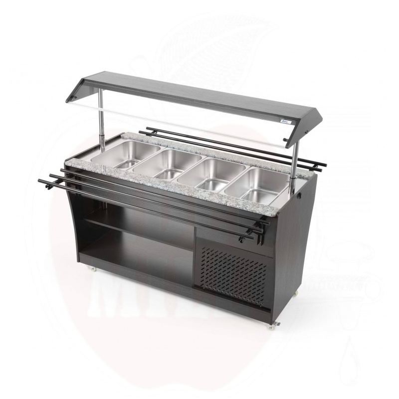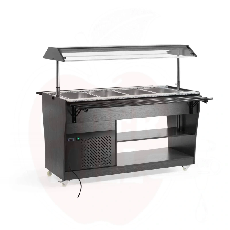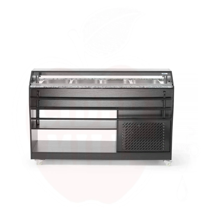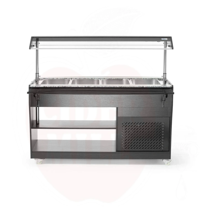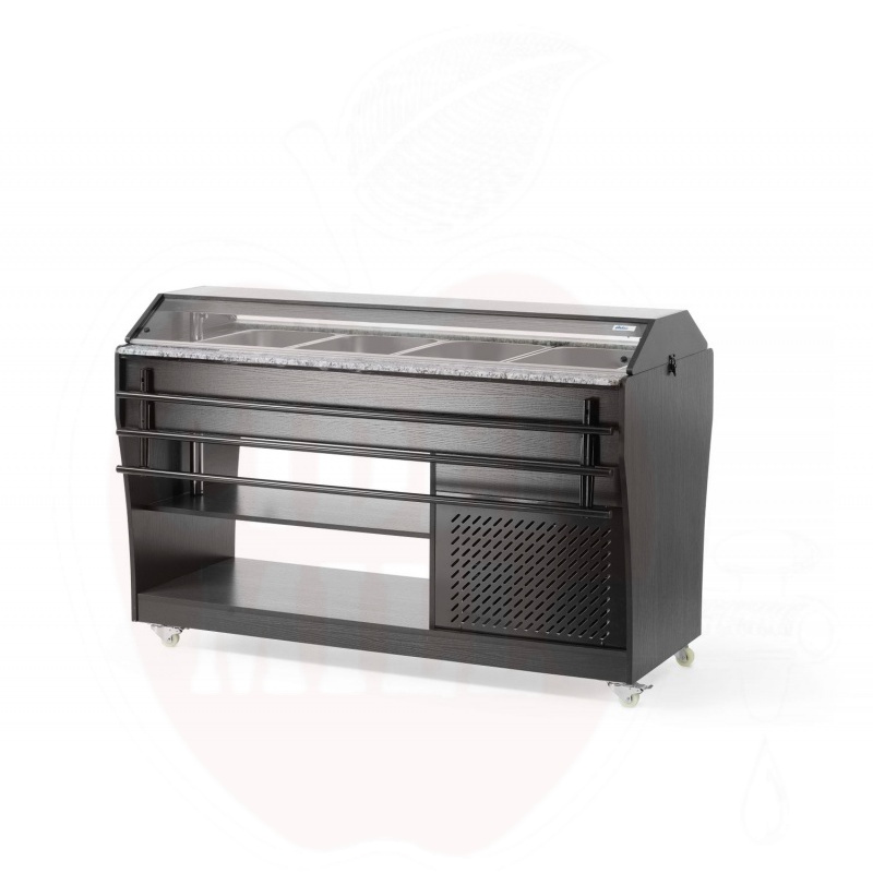 Ammattimainen kylmätiski on valmistettu kestävästä ruostumattomasta teräksestä ja viimeistelty tyylikkäällä mustalla vaneripinnoitteella. Laite mahdollistaa neljän GN 1/1 astian käytön 150 mm maksimisyvyydellä, jotka sisältyvät toimitukseen.