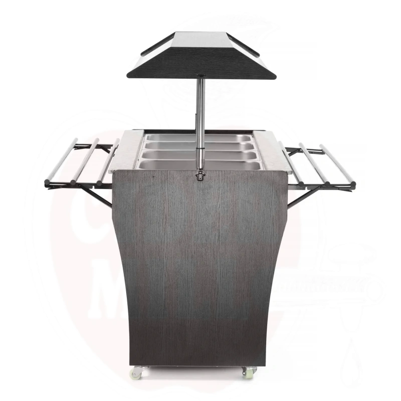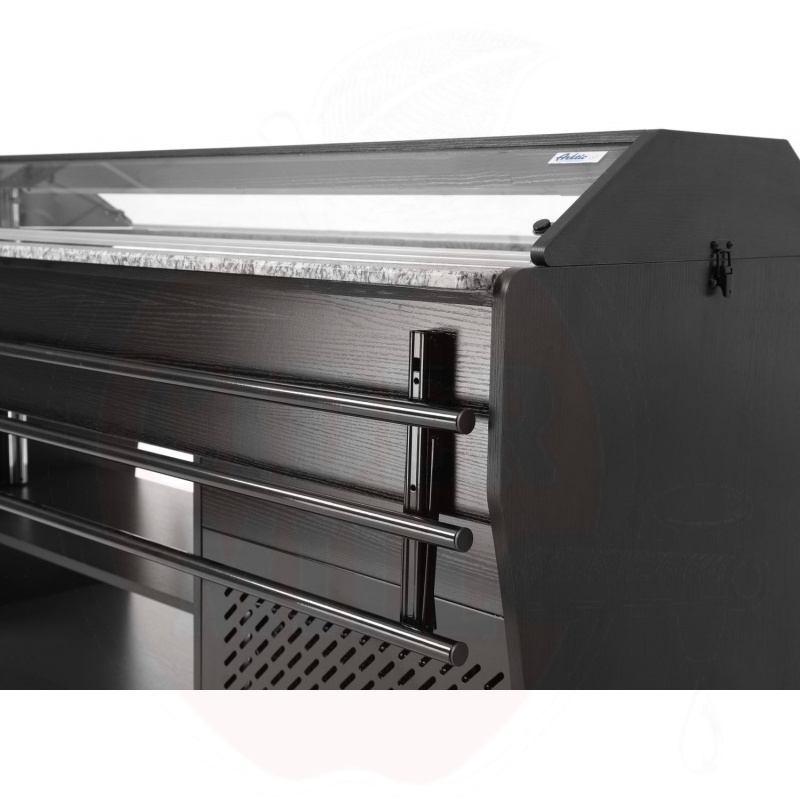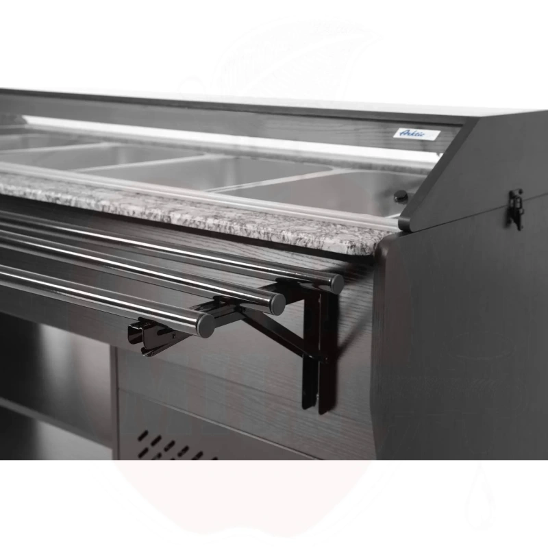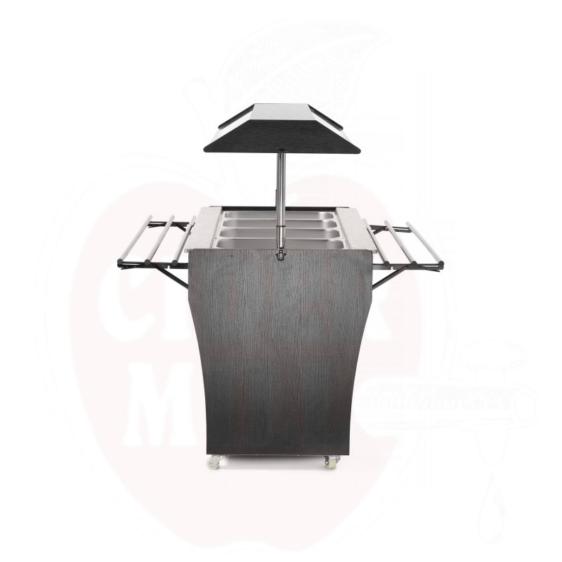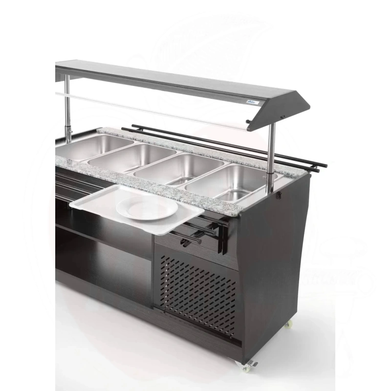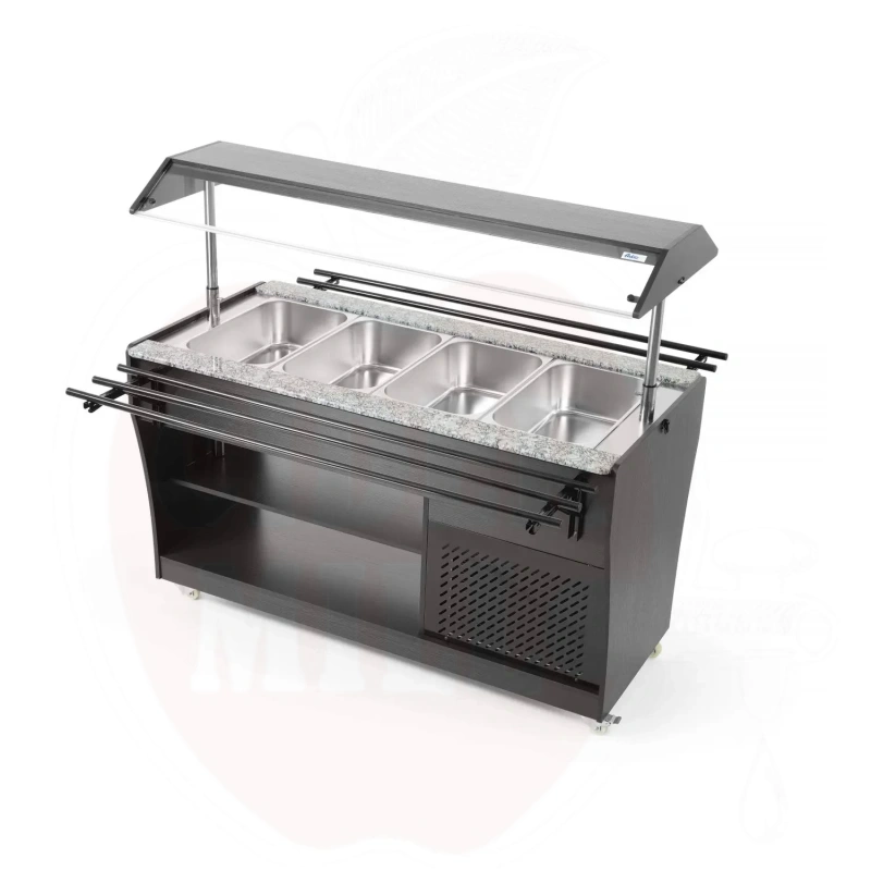 Ammattimainen kylmätiski on valmistettu kestävästä ruostumattomasta teräksestä ja viimeistelty tyylikkäällä mustalla vaneripinnoitteella. Laite mahdollistaa neljän GN 1/1 astian käytön 150 mm maksimisyvyydellä, jotka sisältyvät toimitukseen.