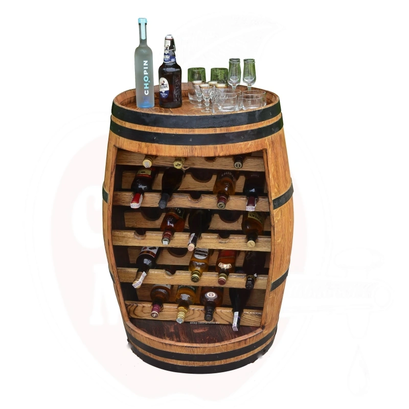 Avainsanat: tammitynnyriesittelyteline, käsityönä valmistettu, pulloteline, viinitynnyrihuonekalu, juomapulloteline, tammitynnyrihuonekalu, kotibaarin sisustus, viinipulloteline