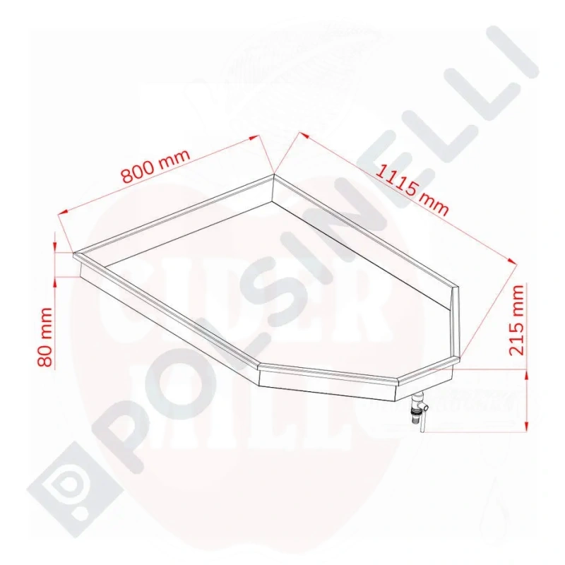 Tekniset tiedot: Mitat: 1115x800x215mm (k). Sisäinen taulun korkeus: 78,5mm. Materiaali: AISI 304 ruostumaton teräs. Venttiili: DN15 3/4" ja Ø20 letkuliitin.