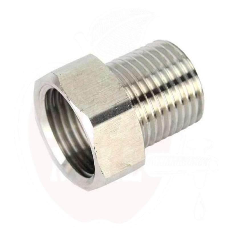 Profesionalus nerūdijančio plieno perėjimas, leidžiantis sujungti 1/2 colio išorinį sriegį su 5/8 colio vidiniu sriegiu. Patvari jungtis puikiai tinka skysčių ir sulčių transportavimui pramonėje bei žemės ūkyje.
