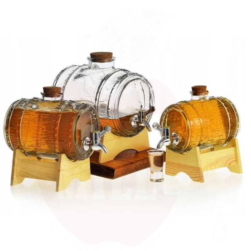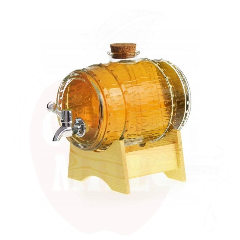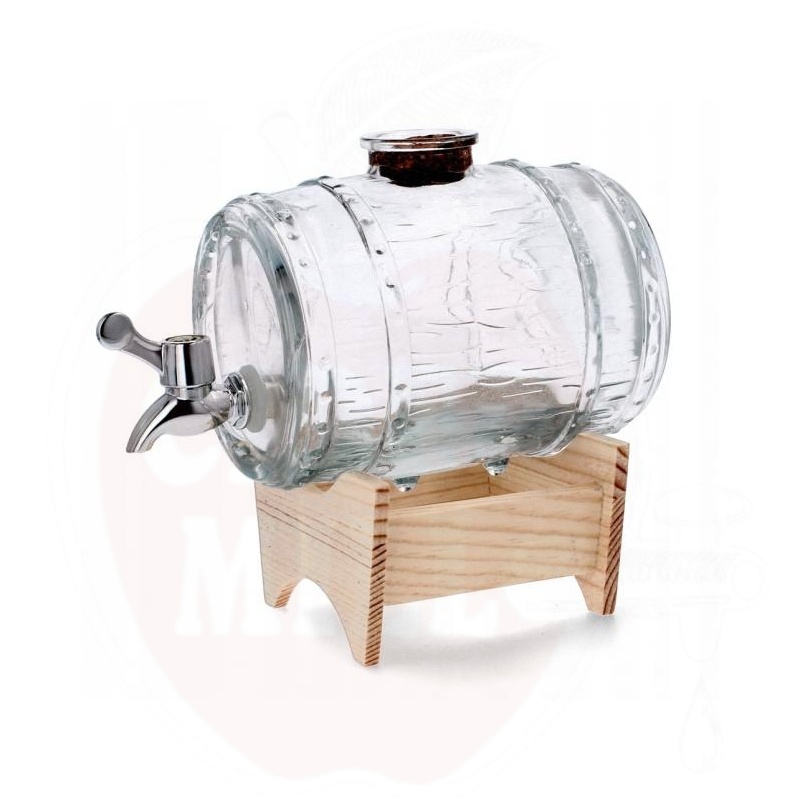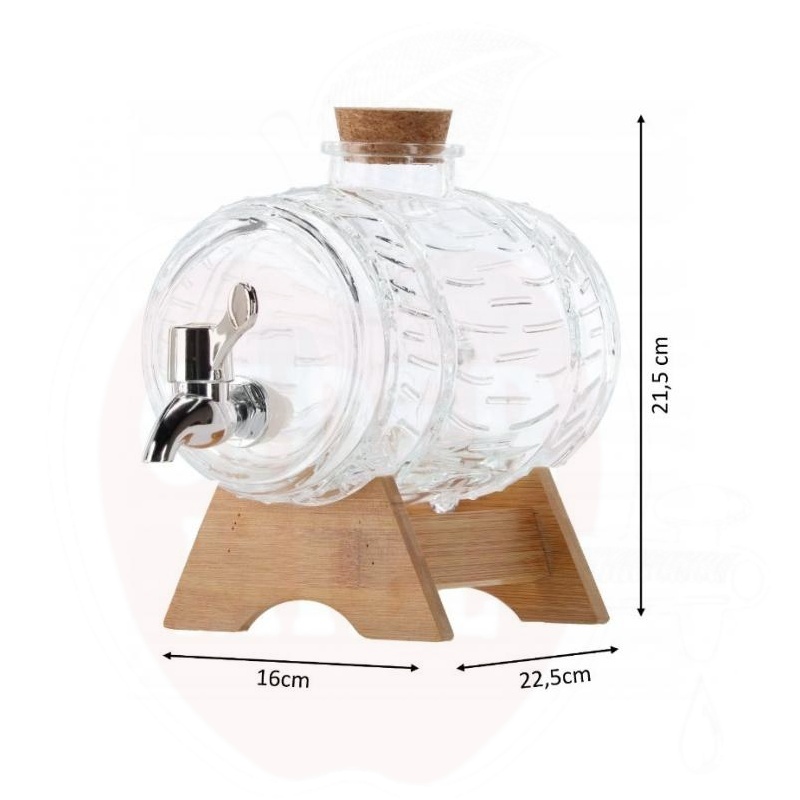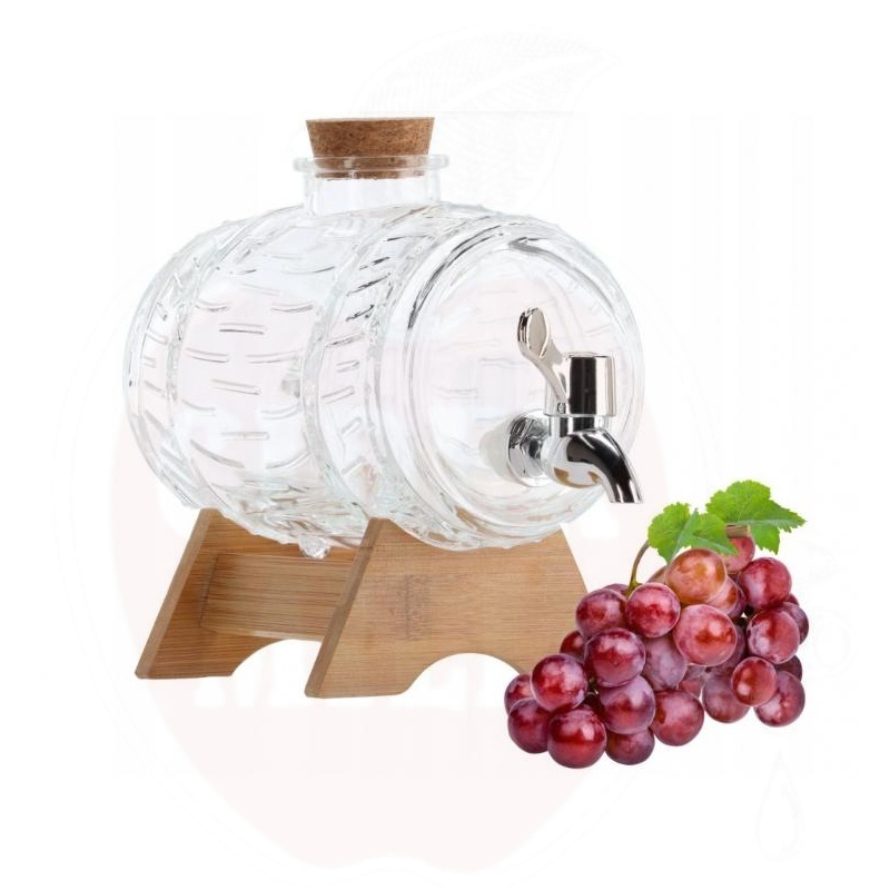 Raktažodžiai: stiklinis indas, medinis pagrindas, gėrimų indas, vyno indas, sulčių indas, dekoratyvinis indas, gėrimų patiekimas, indas su išleidimo vožtuvu