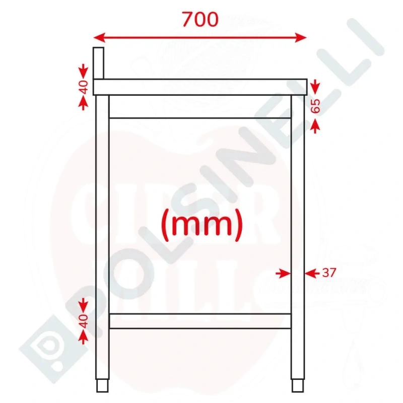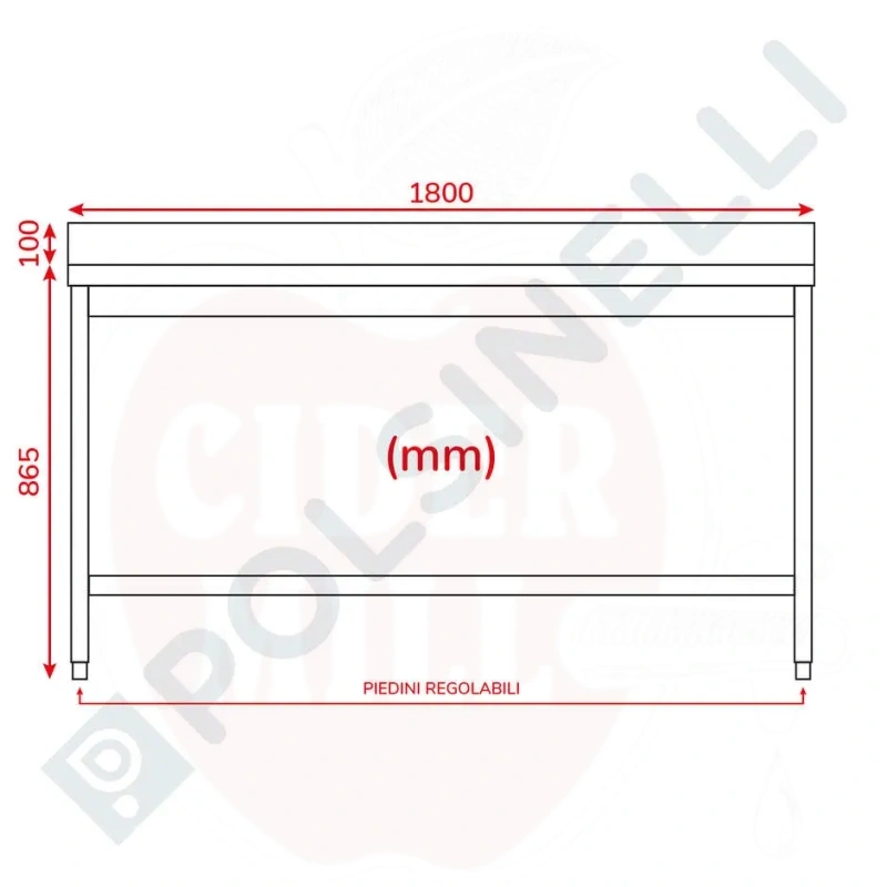 Tehniskie dati: AISI 304 nerūsējošais tērauds, izmēri: 1800x700x965 mm (GxDxA), 100 mm aizmugures šļakstu aizsargs, skaņas izolēts 40 mm plaukts, pastiprināta omega struktūra, noapaļoti stūri.
