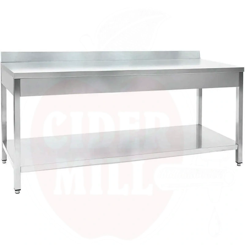 Pārtikas gatavošanai vai citām higiēniskām vidēm AISI 304 nerūsējošā tērauda galds ar plauktu un aizmugures šļakstu aizsargu nodrošina izturību un tīrību. Izstrādāts profesionālai lietošanai, tas ietver skaņas izolētu dobu kodolu plauktu, pastiprinātu apakšējo plauktu, kvadrātveida kājas un regulējamas pēdas. Noapaļoti stūri atvieglo tīrīšanu.
