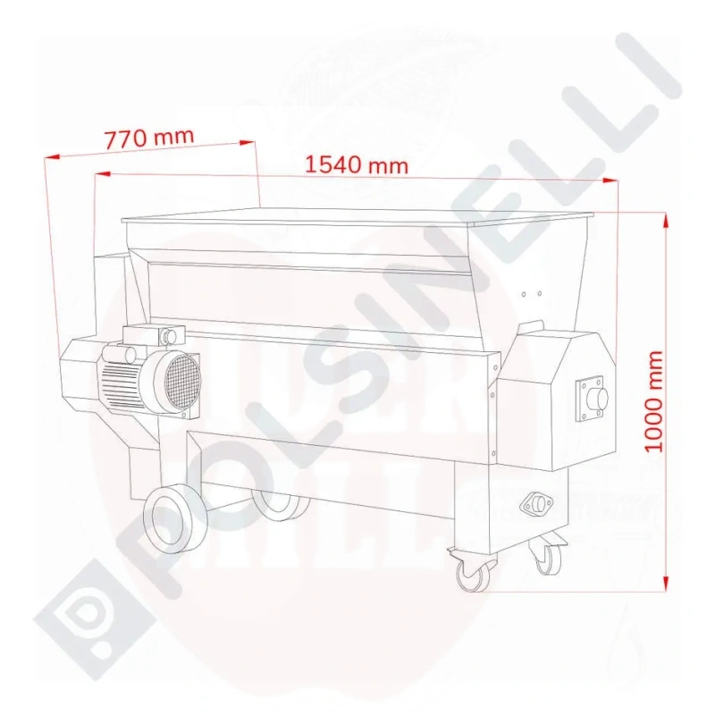 Tehniskie dati: Piltuves izmēri 640 x 1250 mm; stundas ražīgums 4500–5000 kg; barošanas avots: 220V; saderīgs ar 60 mm diametra caurulēm; ražots Itālijā.