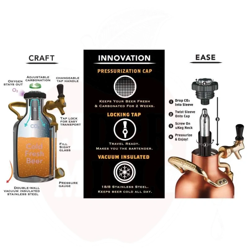 uKeg™ ir inovatīva mini-muca, kas saglabā jūsu iecienītos dzērienus svaigus un gāzētus. Šī 1,9 litru nerūsējošā tērauda tvertne ir paredzēta alus, sidra, kokteiļu un limonādes pasniegšanai.