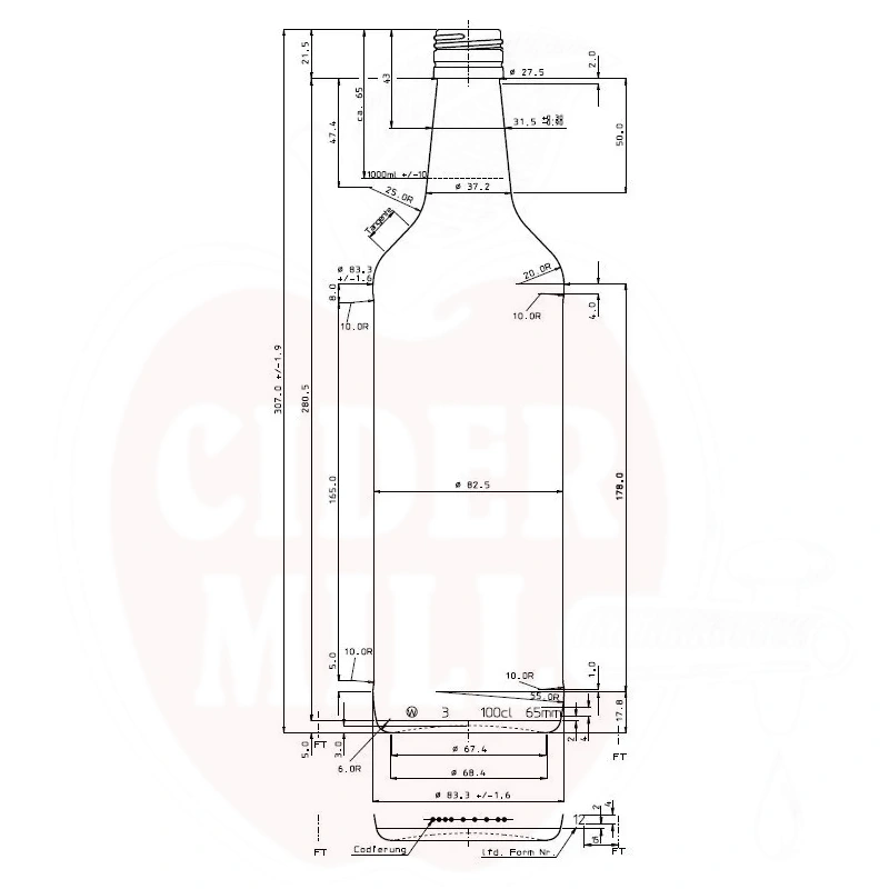 Pudeles ir aprīkotas ar standarta korķa kakla atveri. Korķi jāiegādājas atsevišķi - atrodiet piemērotus piederumus mūsu piedāvājumā. Pudeles var pasūtīt pilnā paletē, kas satur 1631 pudeli septiņos slāņos (233 pudeles katrā slānī).