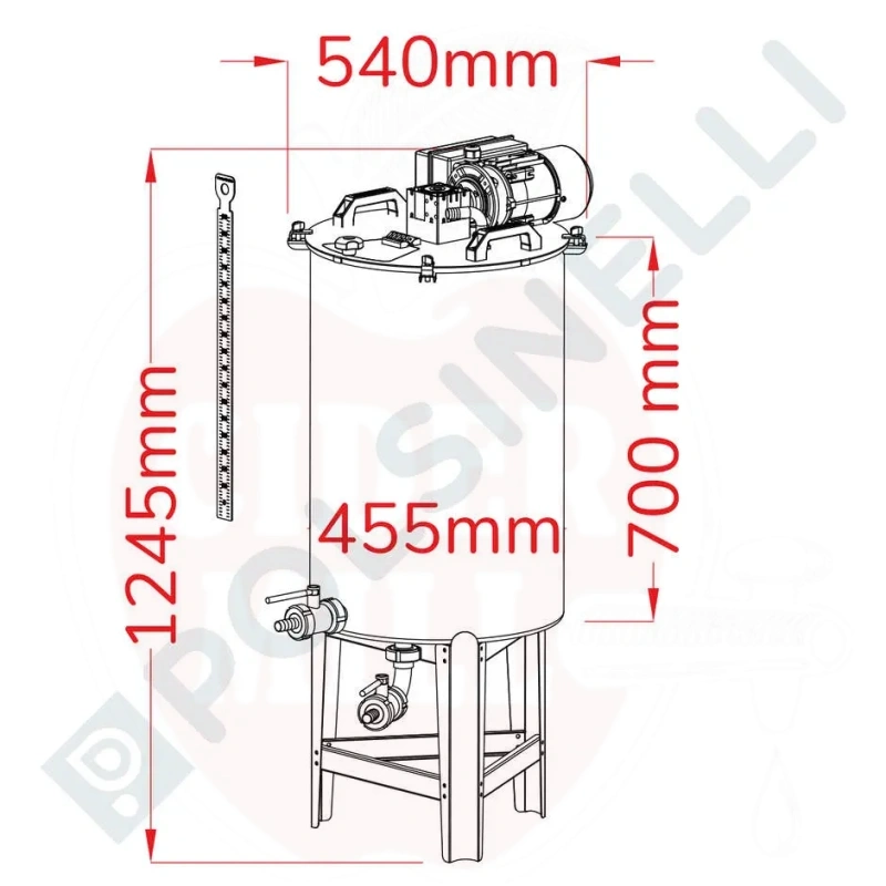 Tehniskie dati: Tilpums 100L; diametrs 455mm (plus 200mm vārsts); augstums 1251mm; DIN 25 vārsts un Ø20 šļūtenes uzgalis; jaudas patēriņš 0,18kW; digitālais displejs.