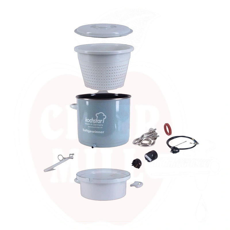 Den emaljerade ytan gör grytan lätt att rengöra och säkerställer hygienisk saftproduktion. Den stora ångkorgen möjliggör bearbetning av betydande mängder bär eller frukt på en gång, vilket sparar tid och energi.