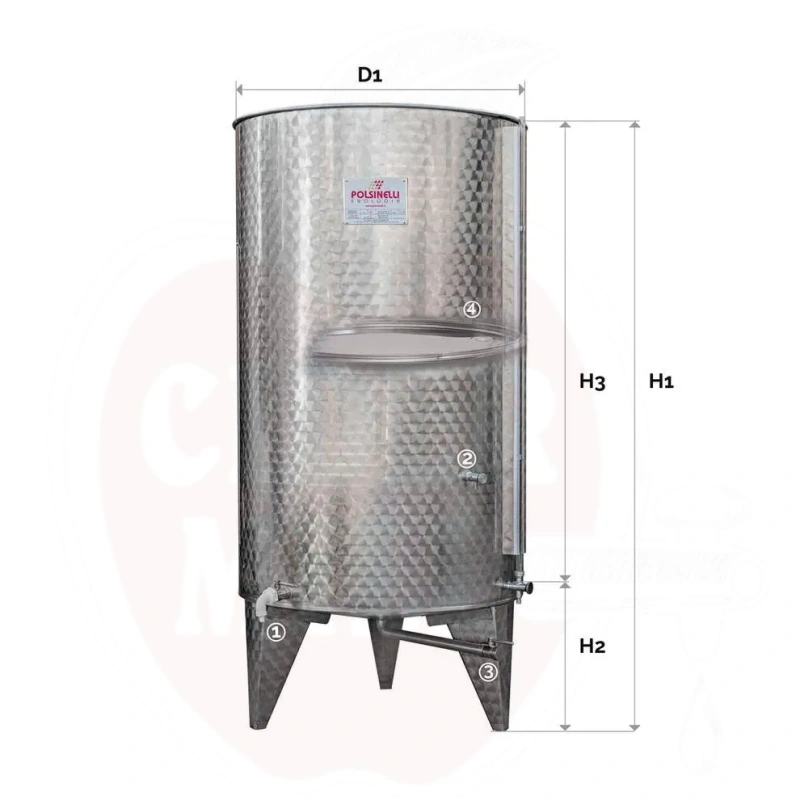 Egenskaper: Tillverkad av AISI 304 18/10 rostfritt stål. Konisk botten (10° lutning) med förstärkningar. 3 rostfria stödfötter. Spegelpolerad inneryta för enkel rengöring. Rostfritt stål luftflytlock med transparent livsmedelsgodkänd plastkammare. Yttre yta är flammad med satinerade svetsar. Inkluderar total- och delvis tömningsventiler, rostfri vinprovskran, dubbelverkande plastventilationsventil och nivåindikator med rostfritt skydd.
