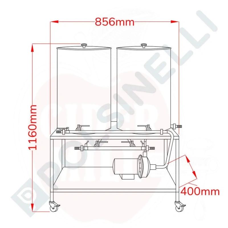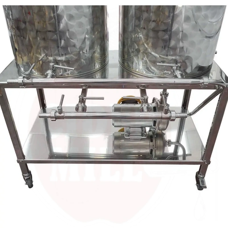 Egenskaper: Två 50-liters rostfria stål 18/10 tankar på en mobil vagn, utrustade med DIN 15 ventiler och anslutningar i rostfritt stål, asynkron elektrisk pump i rostfritt stål (enfas, 230/400V, 50Hz) samt fram-/bottenventiler för effektiv återvinning och rengöring. Flödeshastighet: 110 L/min. Maxtemperatur: 110°C.