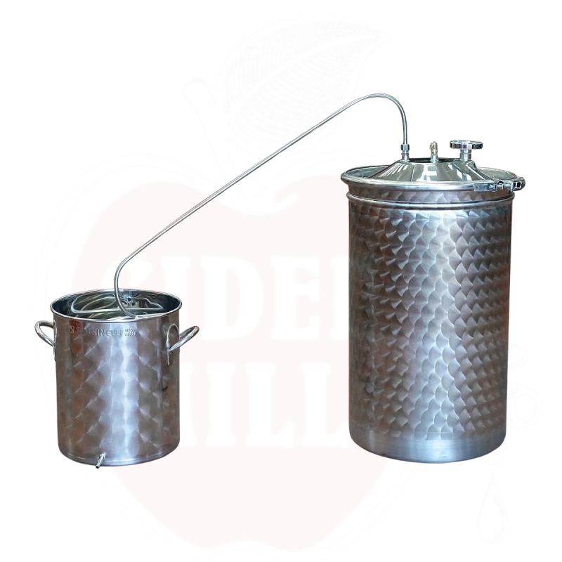 Högkvalitativ 75-liters eterisk oljeutvinningsapparat i rostfritt stål med 25-liters kylningstank. Enheten är tillverkad av hållbart AISI 304 (18/10) rostfritt stål.