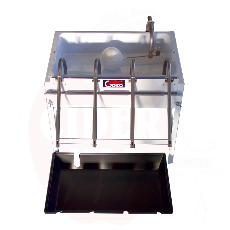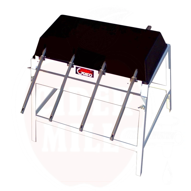 Professionell flaskfyllare i rostfritt stål med 4 munstycken, perfekt för tappning av juice, vin och öl. Enheten är utrustad med högkvalitativa munstycken i rostfritt stål och ett sanitärt plastkar för att säkerställa en hygienisk tappningsprocess.