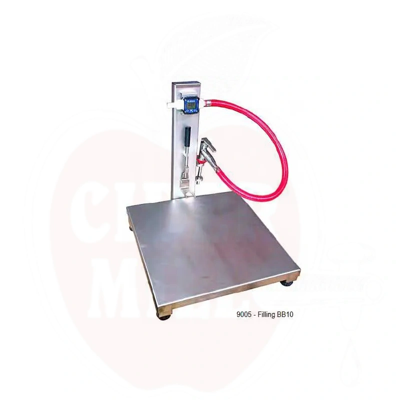 Praktisk och hållbar påfyllningsutrustning i rostfritt stål, speciellt designad för att fylla förvaringspåsar. Utrustningen inkluderar en exakt mätare och ergonomisk påfyllningspistol som möjliggör jämn påfyllning av påsar.