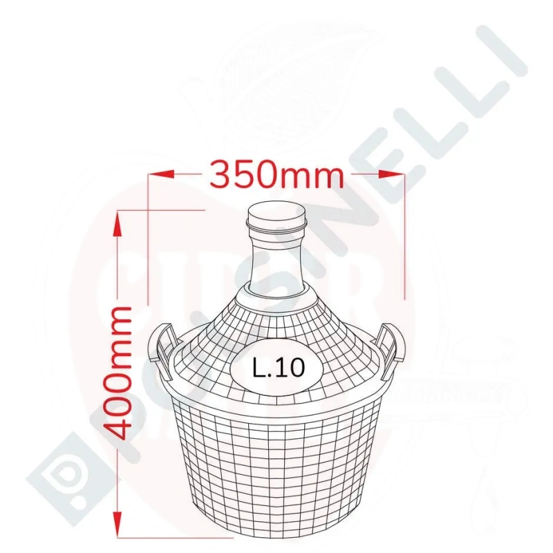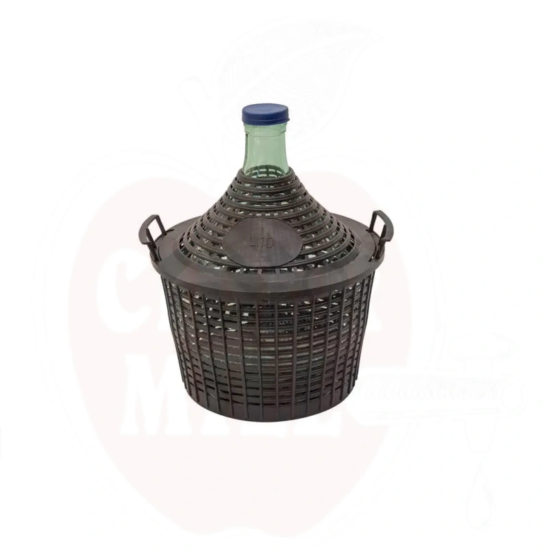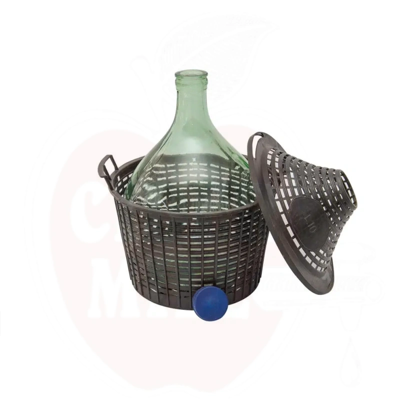 Professionell 10-liters glasflaska med skyddskorg och stabila handtag, idealisk för jäsning och vintillverkning. Komplett med gratis lock för säker förvaring.