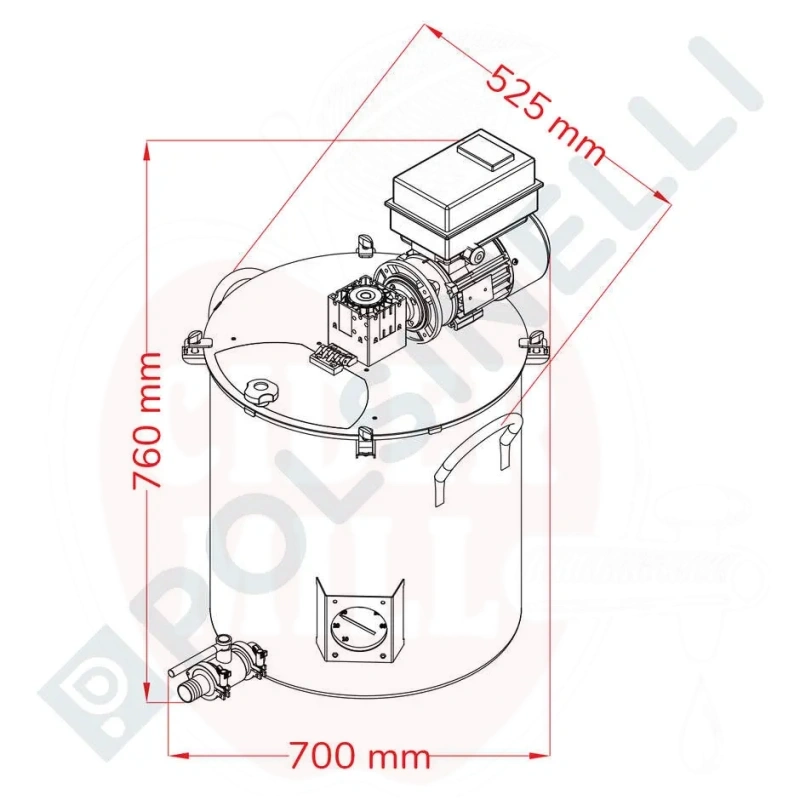 Tekniska data: Kapacitet 75L. Material: rostfritt stål 18/10 (AISI 304). Effekt: 0,18kW, 220V enfas. Innerdiameter: 455mm. Höjd: 495mm. Totalmått (med motor): 525x705mm (höjd). Väggtjocklek: 1mm. Bottentjocklek: 1,5mm. Ej lämplig för induktionsuppvärmning. Analog termometer, digital kontrollpanel, justerbar rotation 6–42 varv/min.