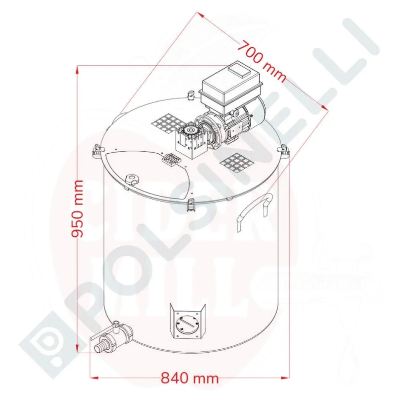 Tekniska data: Kapacitet: 200L. Innerdiameter: 630mm. Höjd: 680mm. Totala mått (med motor): 700 x 950mm (h). Väggstjocklek: 1mm, bottenens tjocklek: 1,5mm. 1 DIN32 kulventil i rostfritt stål. Ångavlopp i det tjocka locket i rostfritt stål. Ej lämplig för induktion.