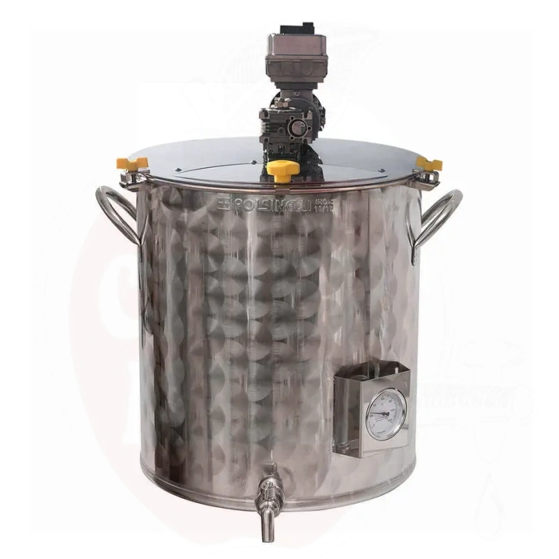 Egenskaper: Tillverkad av 18/10 rostfritt stål (AISI 304) för maximal hållbarhet och hygien. Den tjocka botten bibehåller värme, medan en växelmotor med frekvensomriktare ger justerbar rotationshastighet (6–42 rpm) och reversibel rörelse, allt kontrollerat via en digital knappsatspanel. Den har en professionell analog termometer för temperaturövervakning, ett tjockt lock i rostfritt stål med krokar, en 1" kran i rostfritt stål för enkel tömning, hållbara handtag i rostfritt stål och ett integrerat skydd för termometern. Inte lämplig för induktionsvärmesystem.