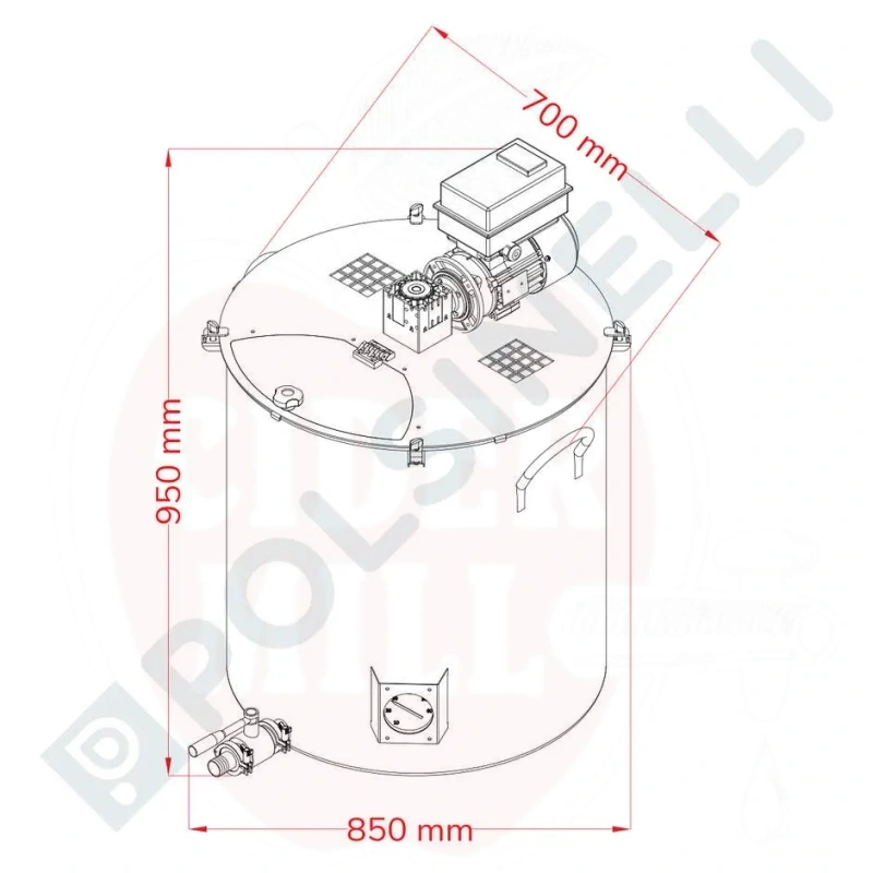 Tekniska data: 220V enfasmotor, justerbar 0,18 kW frekvensomriktarmotor, kapacitet 200L, inre diameter Ø630 mm, höjd 950 mm (med motor), totala mått 700 × 950 mm, bottentjocklek 1,5 mm, väggtjocklek 1 mm. Inkluderar Tri-Clamp DN25 ventil, livsmedelsgodkänd silikonskrapa på nedre blad, rostfria handtag och omrörare.