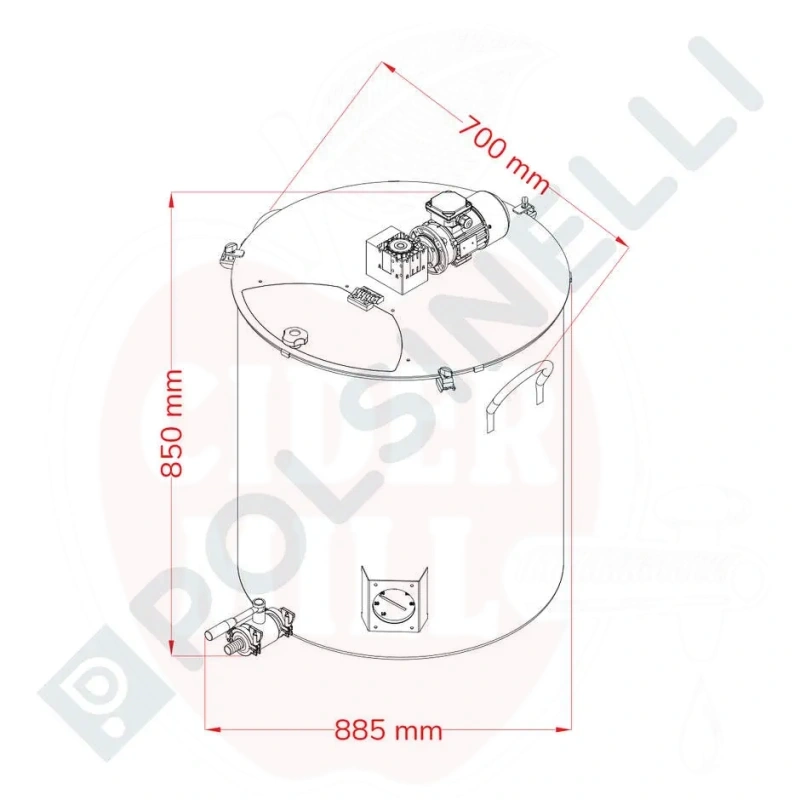 Tekniska data: Kapacitet: 200L. Innerdiameter: 630mm. Höjd: 680mm. Totala mått med motor: 760 x 840mm (h). Väggstjocklek: 1mm. Bottentjocklek: 1,5mm. Strömförsörjning: 220V. Effektförbrukning: 0,09kW. Rotationshastighet: 28 rpm. Lock: förstärkt rostfritt stål med krokar. Kran: 1 rostfri stålventil (CLAMP 1 1/2). Display: analog termometer. Ej lämplig för induktionshällar.