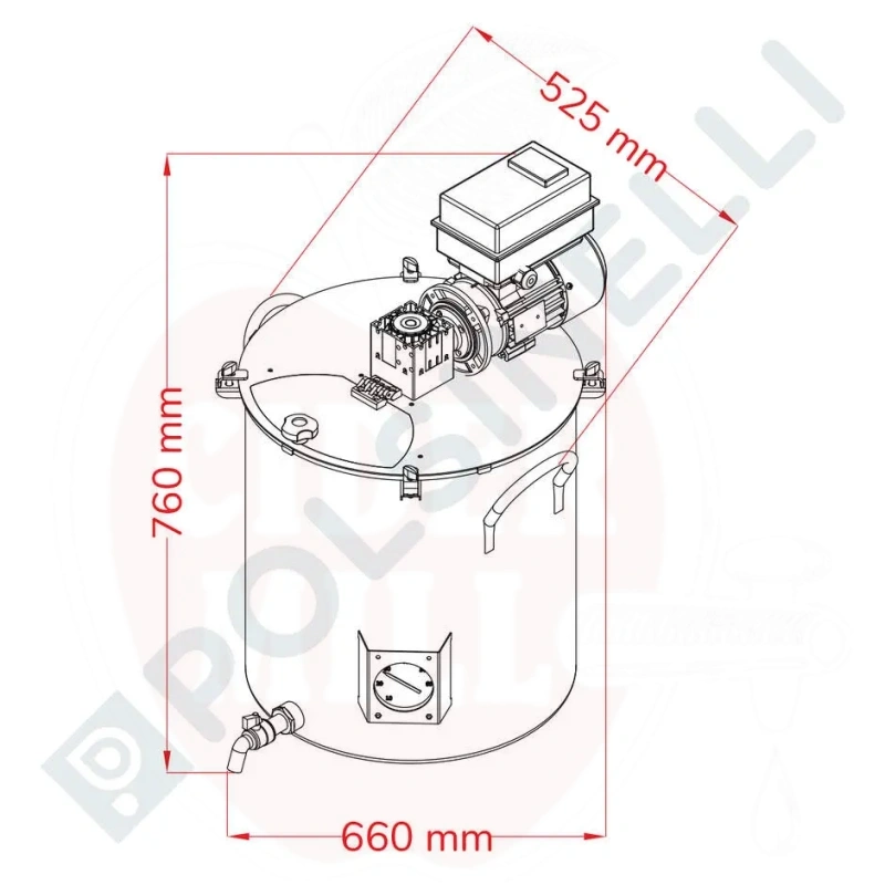 Tekniska data: Kapacitet: 75 L. Motor: Enfas 220V, 0,18 kW. Innerdiameter: 455 mm, höjd: 495 mm. Totala mått med motor: 525 x 705(h) mm. Bottentjocklek: 1,5 mm. Väggtjocklek: 1 mm. Utrustad med professionell analog termometer, kran och rostfritt stål skydd. Justerbar hastighet från 6 till 42 rpm via frekvensomriktare.