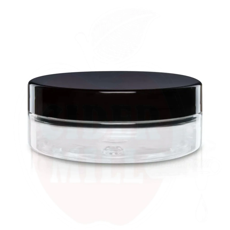 Högkvalitativ transparent PET-burk med svart lock, perfekt för förvaring av kosmetika, balsam, serum och andra hudvårdsprodukter. Burken är tillverkad av hållbar PET-material som säkerställer säker förvaring av innehållet.