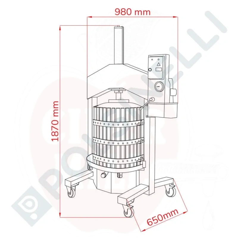 Tekniska data: Mått: 980 x 650 x 1870 mm (h). Korgstorlek: 400mm inner, 470mm yttre diameter, 550mm höjd. Effekt: 700W. Utmatning: 250kg/h (druvor). 1" GAS bottenutsläpp.
