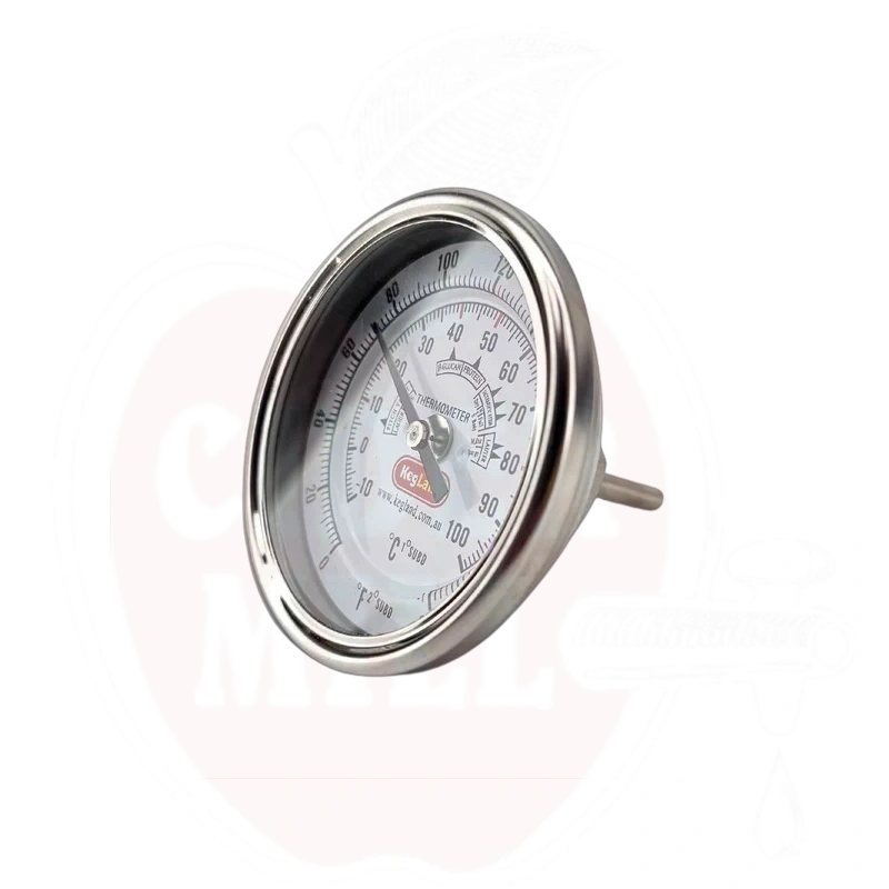 Bimetall-termometer med 3-tums visartavla och kort skaft, som möjliggör precis temperaturkontroll vid ölbryggning. Den svetsningsfria monteringen är idealisk för bryggningsutrustning.