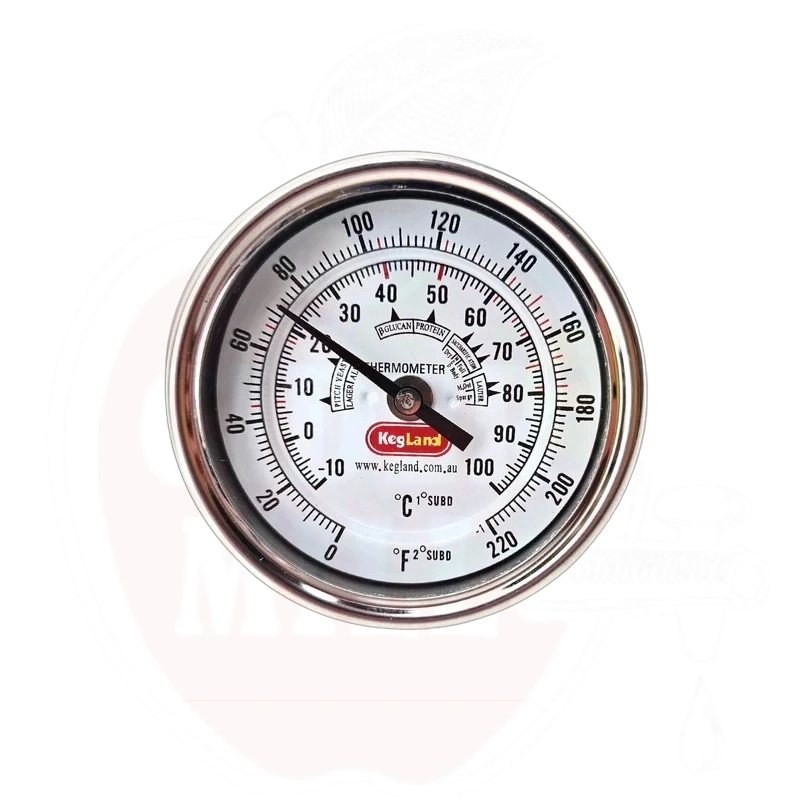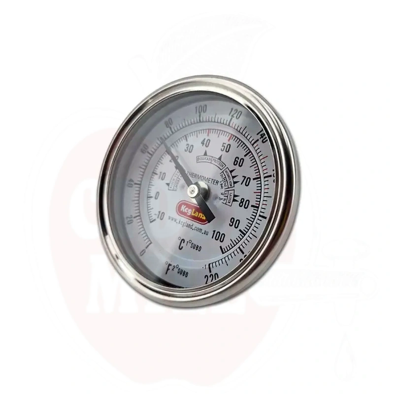 Med denna bimetall-termometer kan du brygga med självförtroende. Den svetsningsfria passformen gör att den kan monteras på din mäsktunna, varmvattentank eller kittel. Det 132 mm långa proben gör att du kan få en exakt avläsning direkt i kärlets kärna. Idealisk för exempelvis stora mäsktunnor.